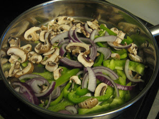 1. Core and slice green pepper. Slice onion. Heat large skillet to medium heat and add olive oil. Add peppers, onions, and mushrooms. Saute until onions begin to be translucent and peppers begin to soften.