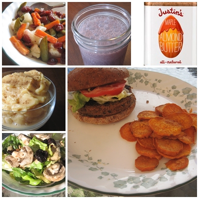 - Amy's Bistro Burgers with lettuce, tomato, and olive oil mayo on Ezekiel buns (thinking of selling these, too) and home-baked sweet potato chips